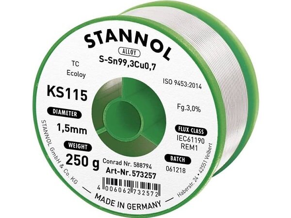 Stannol KS115 Lödtenn, blyfri Spole Sn99.3Cu0.7 250 g 1.5 mm