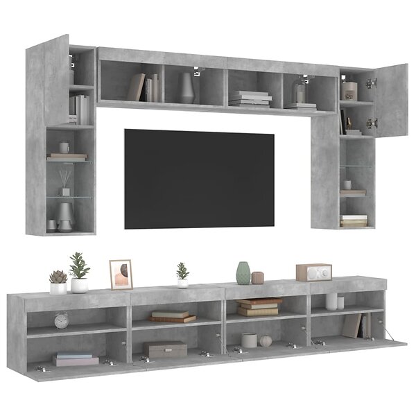 vidaXL Väggmonterade tv-skåp 8 delar med LEDs betonggrå 3216767
