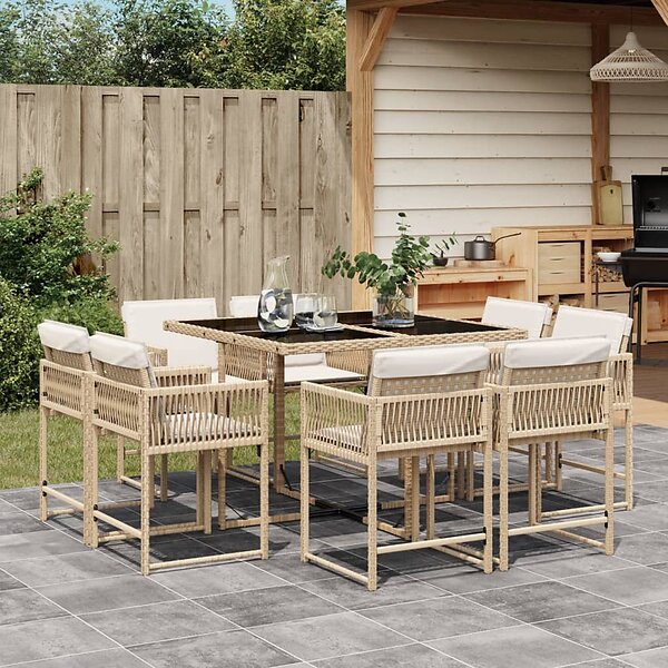 vidaXL Matgrupp för trädgården med dynor 9 delar beige konstrotting 3211558