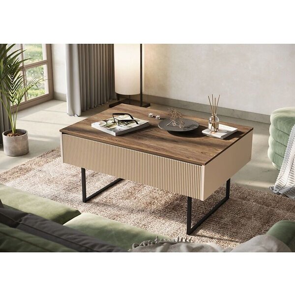 Bobochic Table basse 1 porte 100 cm LOUNA beige et effet bois avec tasseaux et LED