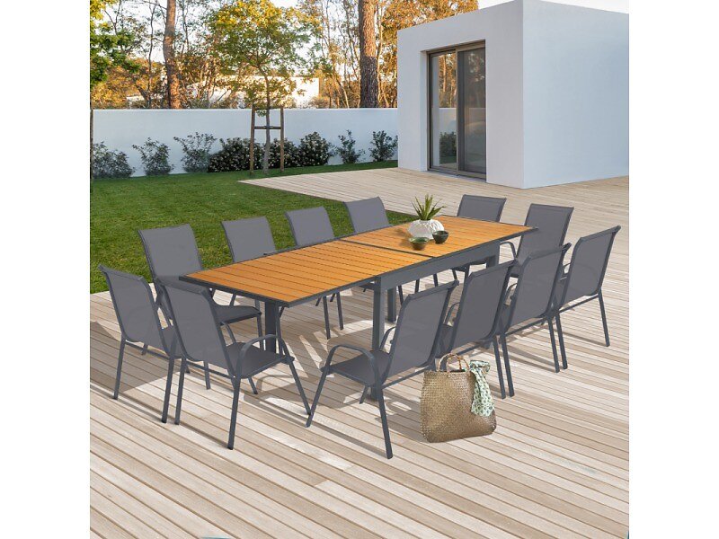 IDMarket Salon de jardin POLY extensible table 135-270 CM et 12 chaises bois et gris foncé