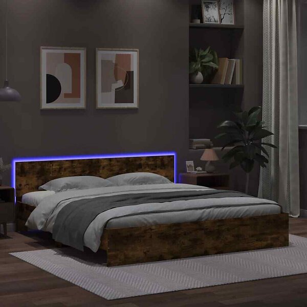 vidaXL Sängram med huvudgavel och LED rökfärgad ek 200x200 cm
