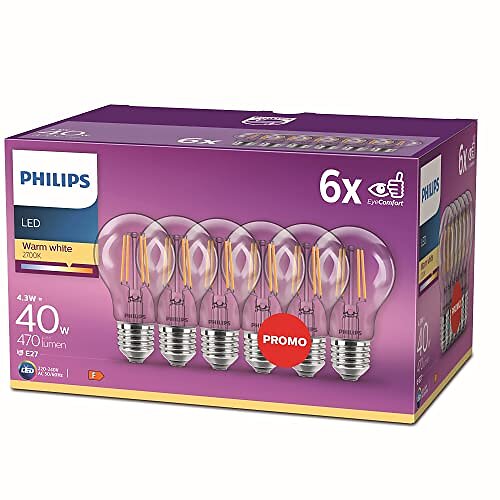Le meilleur prix pour Philips LED-klassisk ersätter 40 W, E27, A60, 6-pack, varmvit (2 700 Kelvin), 470 lumen, klar est actuellement de 13,19 €. leDénicheur compare les promos et les offres de 2 marchands en ligne.