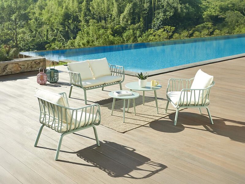 Le meilleur prix pour Mylia LOYNA Salon de jardin en polypropylène et métal : un canapé 2 places, 2 fauteuils et 2 tables basses Vert amande est actuellement de 549,99 €. leDénicheur compare les promos et les offres de marchands en ligne.