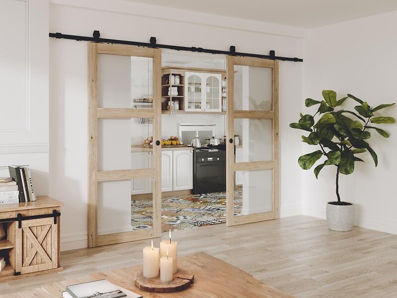 Vente Unique Porte coulissante double avec système en applique en bois et verre trempé 3 fenêtres 2 x H205 x L93 cm ACOSTA II