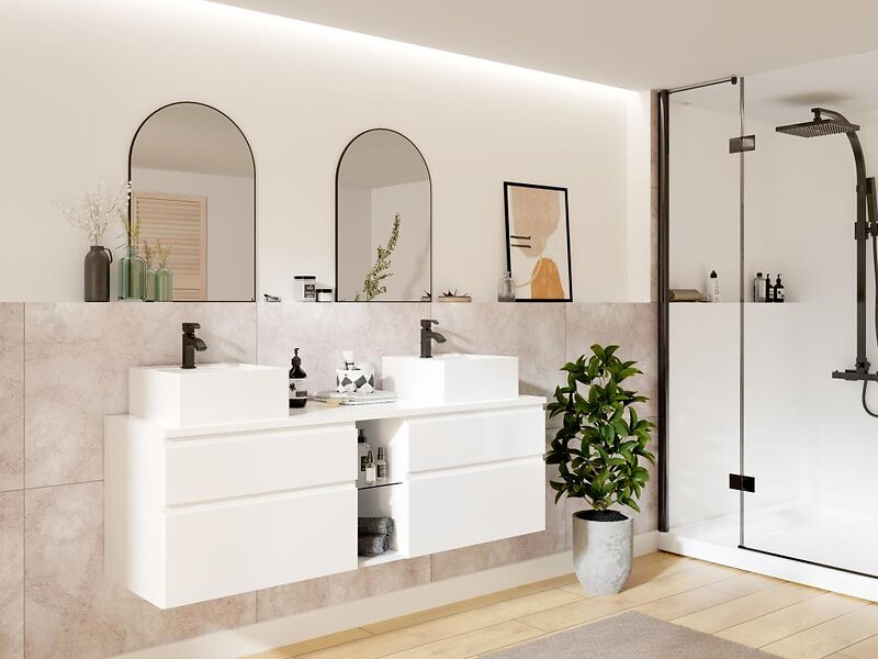 Vente Unique Meuble de salle de bain suspendu avec double vasque Blanc 150 cm MAGDALENA II