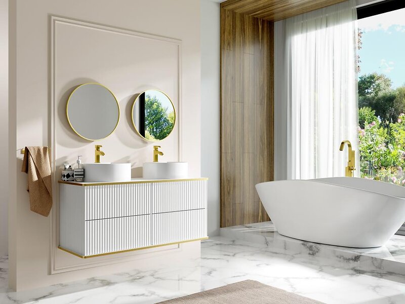 Vente Unique Meuble de salle de bain suspendu strié liseré doré avec double vasque à poser ronde Blanc 120 cm KELIZA