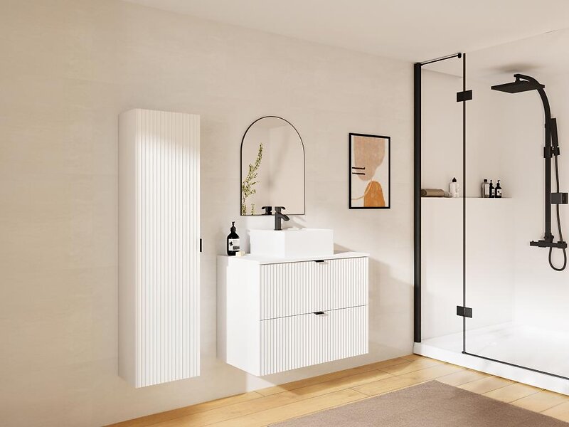 Vente Unique Meuble de salle de bain suspendu strié avec vasque à poser et colonne Blanc mat 80 cm ZEVINI