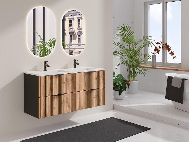 Vente Unique Meuble sous vasque suspendu strié Naturel clair et noir 120 cm MADELA