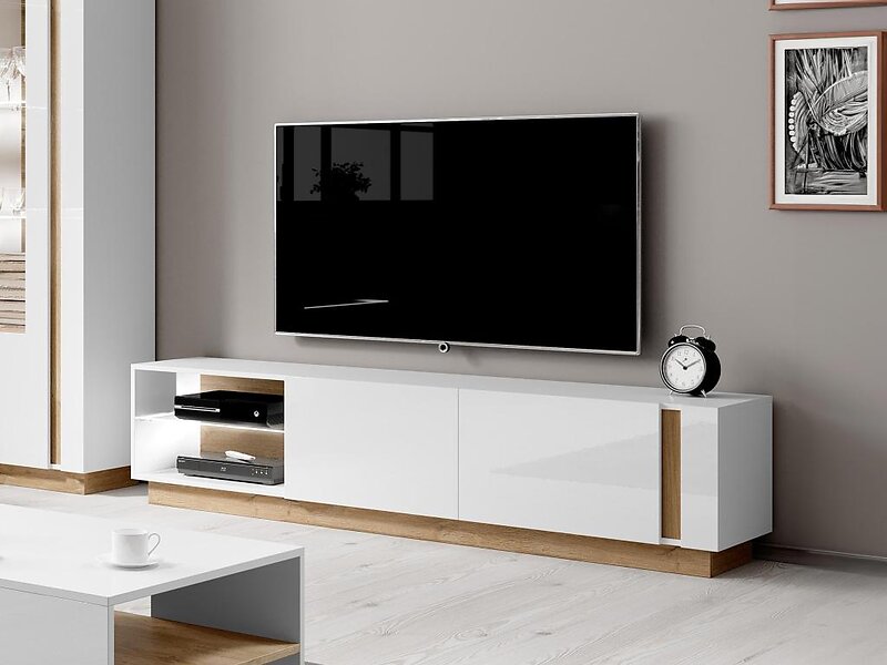 Vente Unique Meuble TV MURARI 2 portes et 2 niches Avec LEDs Blanc brillant et chêne