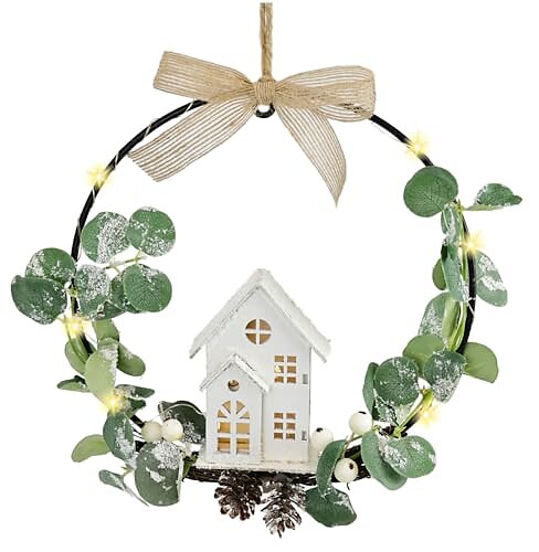Flair Flower 707603W Anneau en métal décoré avec maisons LED, eucalyptus, pommes de pin LED 22cm