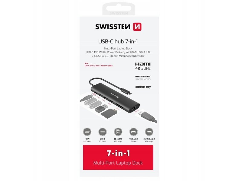 Swissten 7in1 USB-C Hub Laptop Dock HDMI 4K SD MicroSD 8595217487376