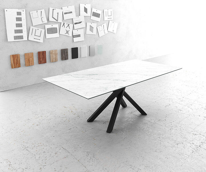 DELIFE Table-à-manger Edge 200x100cm Laminam céramique blanc pieds milieu croisé noir