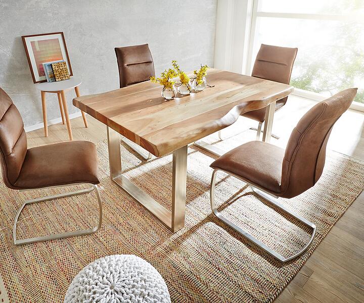 DELIFE Table-à-manger Edge 140x90 XL acacia nature acier inoxydable mince Live-Edge