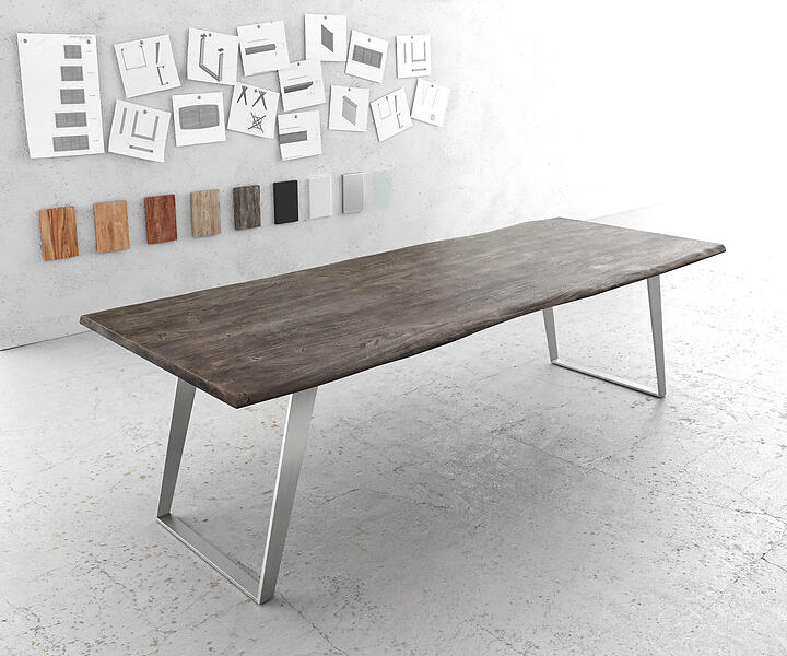 DELIFE Table-à-manger Edge 260x100cm acacia platine acier inoxydable argent incliné Live-Edge