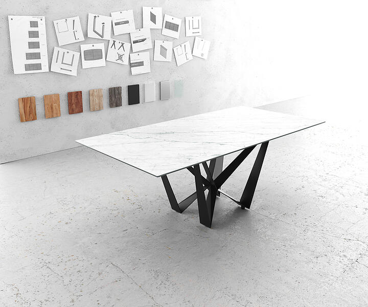DELIFE Table-à-manger Edge 200x100cm Laminam céramique blanc pieds milieu acier plat noir