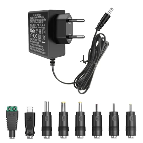 Adaptateur AC 12V 2A Alimentation, 12 Volt Power Supply pour LED Strip Electronique LED Bande Lumière CCTV Caméra Routeur Moniteur LCD Disque Dur Externe, avec 8 adaptateurs DC mâle
