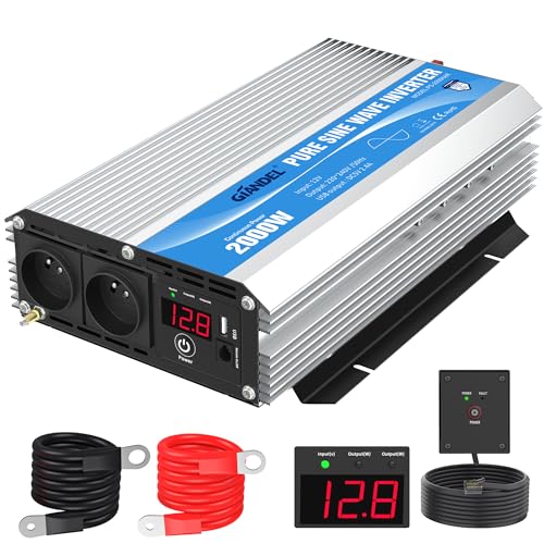 GIANDEL 2000W Convertisseur 12V 220V Pur Sinus Onduleur à Onde Sinusoïdale Pure Transformateur Compatible Lithium-Batteries, pour La Maison, RV, Camion, Hors Réseau Solaire avec Affichage LED