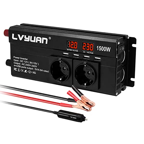 LVYUAN Convertisseur 12v 220v 1500W DC à AC convertisseur de Puissance Voiture onduleur Transformateur avec 4 Ports USB, 2 Prises EU et 2 Prises pour Allume cigares