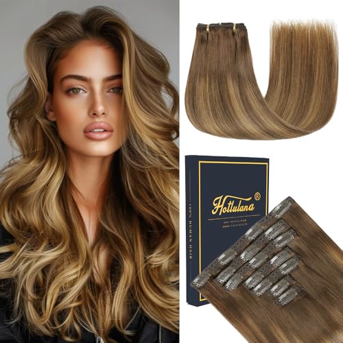 HotLulana Extension a Clip Cheveux Naturel 7pcs 35cm Rajout Cheveux Clip Naturel 14 Pouce Extension Cheveux Naturel 80g Human Hair Clip In Extension 4/4/27#