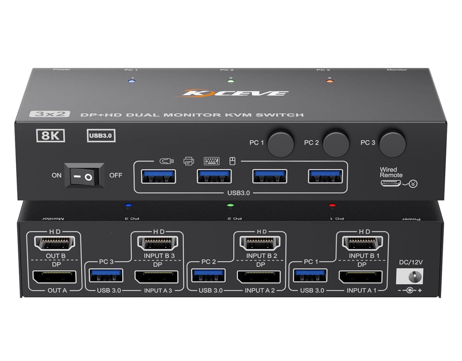 Kvm Commutateur Kvm 3 Pc 2 Moniteurs 8K @ 60 Hz,4K @ 144 Hz,Hdmi Et Displayport Dual Monitor Avec 4 Ports Usb 3.0 Pour Clavier,Souris,Imprimante,Avec Télécommande Par Câble,Adaptateur