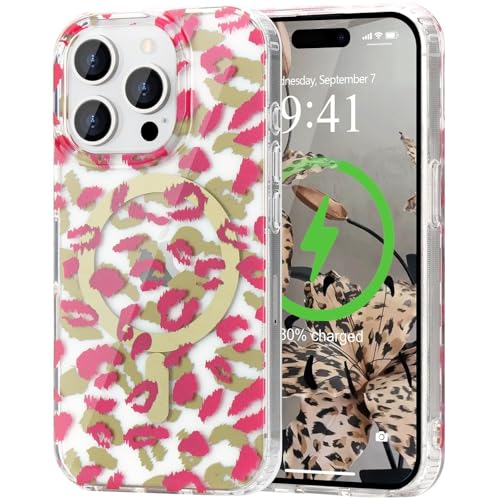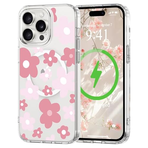 L-FADNUT Coque Magnétique pour iPhone 15 Pro Max [Coque Compatible avec MagSafe] Transparente Silicone Motif de Fleur Fine Antichoc Étui de Protection pour iPhone 15 Pro Max Rose