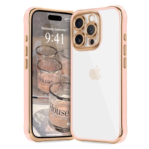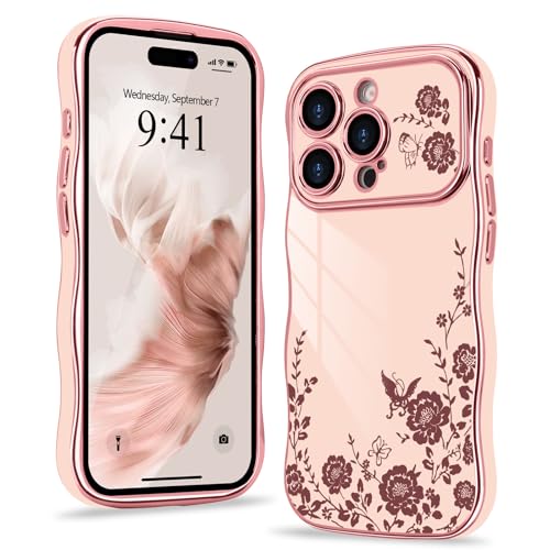 Wirvyuer Coque Compatible avec iPhone 15 Pro Coque Motif Floral Bord Forme Ondulé Bouclée avec Protection Caméra Fille Galvanisé Étui Silicone Case pour iPhone 15 Pro Rose