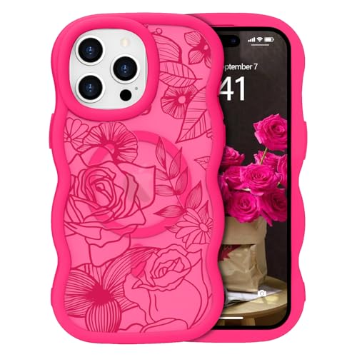 L-FADNUT Coque magnétique pour iPhone 15 Pro Max, Compatible avec MagSafe, Jolie Coque de Protection ondulée et bouclée avec Motif Floral, Coque Transparente Mate pour iPhone 15 Pro Max, Rose Rouge