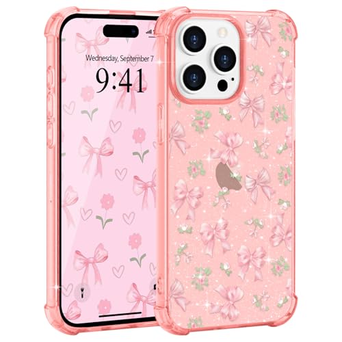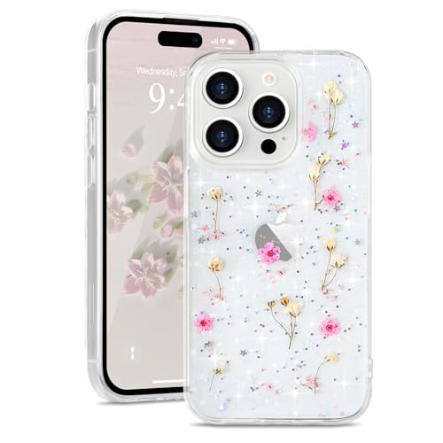 L-FADNUT Compatible avec iPhone 15 Pro Coque Fleurs Séchées Transparent Paillettes Coque de Protection Femme Fille Floral Coque Souple Silicone Bumper Case pour iPhone 15 Pro, Rose