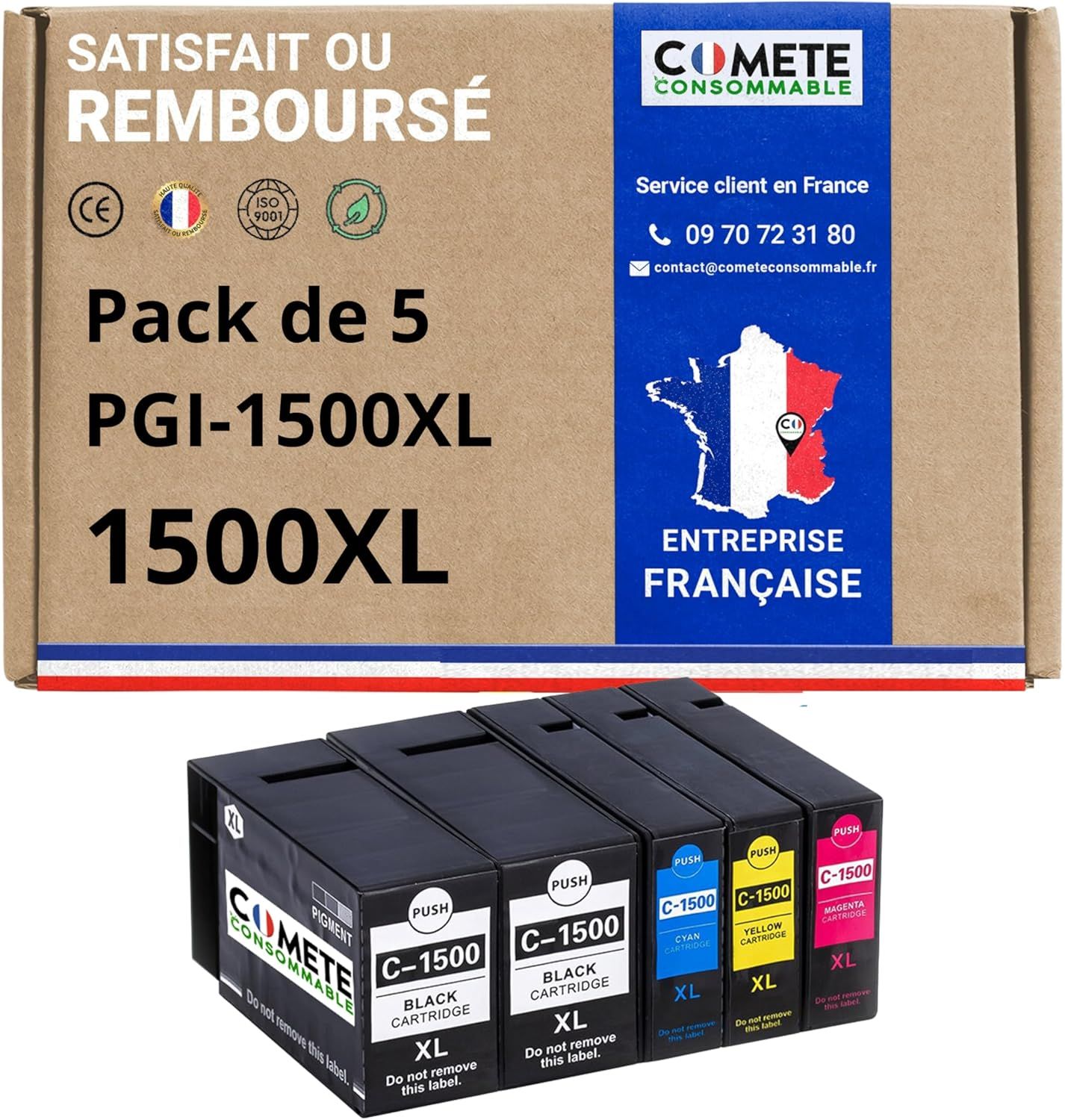COMETE, Marque française - PGI1500XL - 5 Cartouches Compatibles avec Canon PGI-1500 XL 1500XL 1500 XL - pour Canon Maxify MB 2050 2100 2150 2155 2300 2350 2700 (2 Noir et 3 Couleur)