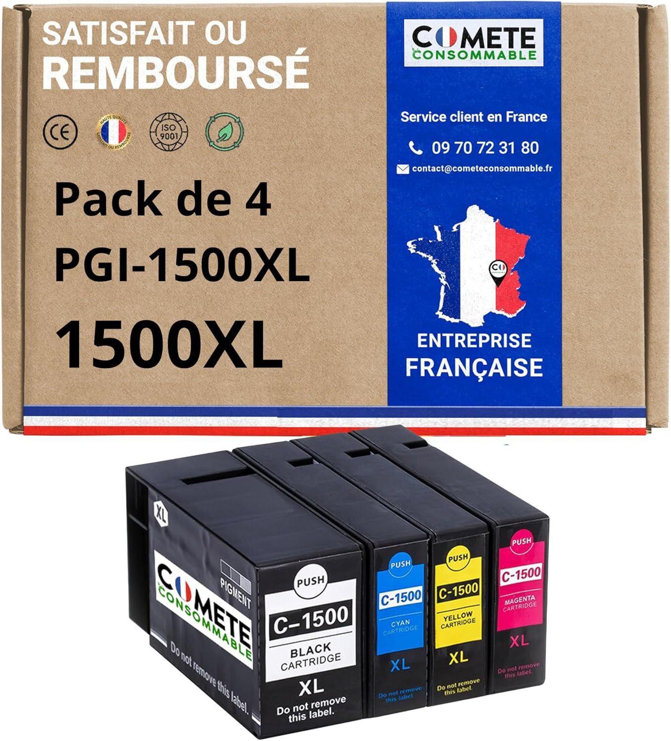 COMETE, Marque française - 1500XL - 4 Cartouches d'encre Compatibles avec Canon PGI-1500 XL PGI1500XL 1500 XL - pour Canon Maxify MB 2050 2100 2150 2155 2300 2350 2700 (1 Noir et 3 Couleur)