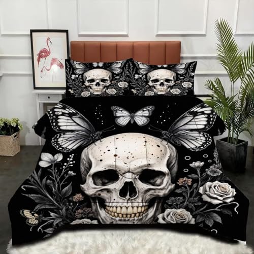 Gumntun Couette 200 x 200 cm Papillon CrâNe Noir, Couette sans Housse 2 Personnes en Microfibre, Couette Tempérée Douceur Lavable en Machine mit 2 Taies d'oreiller 65 x 65 cm_22710a