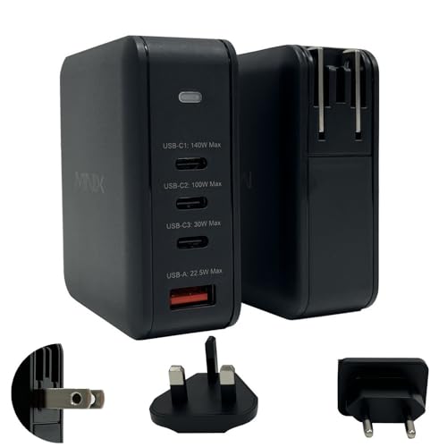 MINIX P165 4 Ports Chargeur Mural 165W, avec 3 Ports USB-C, 1xUSB-C1 PD3.1 (140W) 1xUSB-C2 3.0 (100W) 1xUSB-C3 3.0 (30W) + 1xUSB-A 22,5W Charge Rapide pour Ordinateur Portable, Tablette, Smartphone
