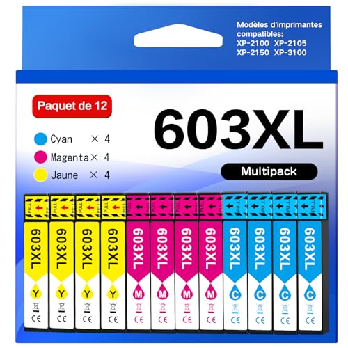 Jhaan Lot de 12 cartouches d'encre 603XL compatibles avec Epson 603XL 603 XL pour Epson Expression Home XP-3100 XP-3105 XP-3150 XP-2100 XP-4155 XP-4150 XP-4100 Workforce WF-2810 WF-2830 WF-2835