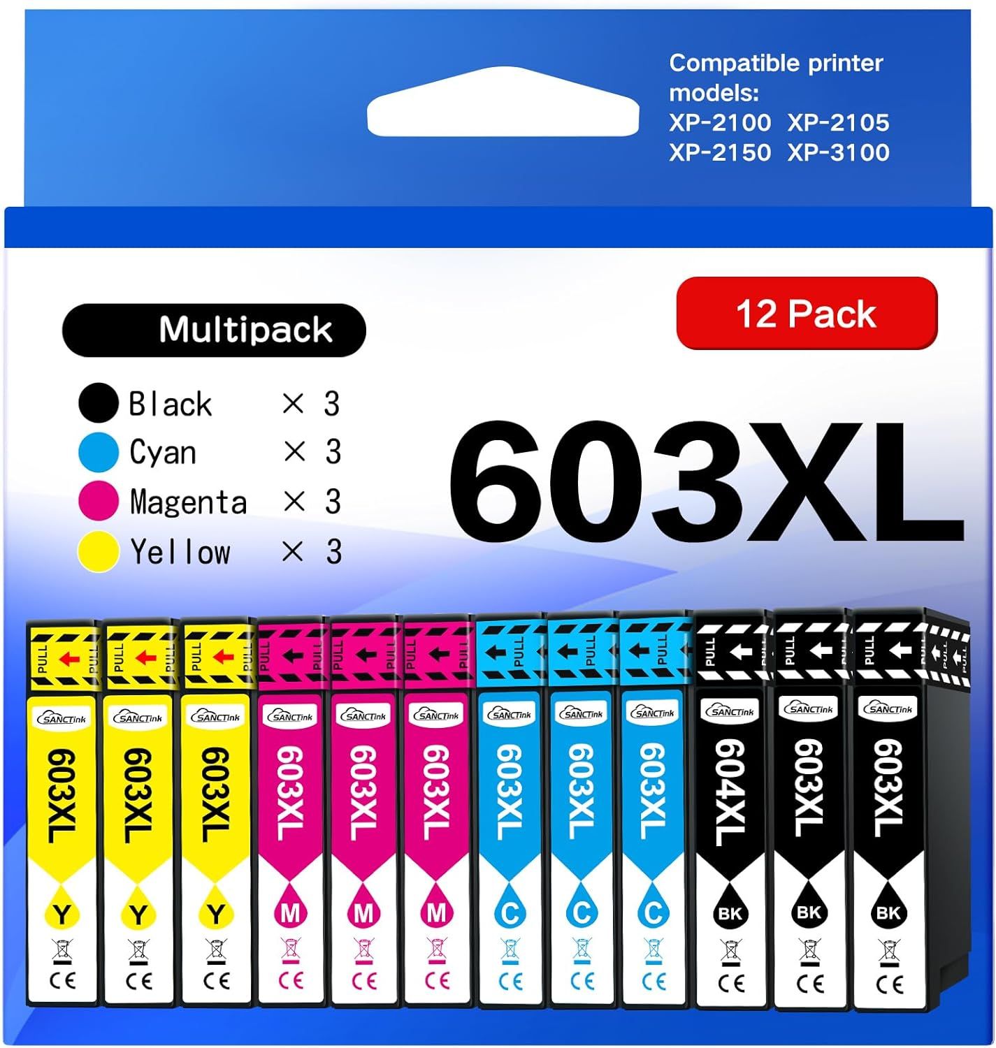 SANCTink 603XL 603 XL Lot de 12 Cartouches d'encre Compatibles avec Epson 603 XL pour Epson Expression Home XP-2105 XP-3100 XP-2100 XP-3105 XP-4100 XP-4105 Workforce WF-2850 WF-2810 WF-2835 WF-2830