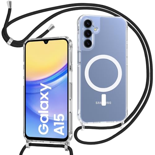 ZYIMOU Coque pour Samsung Galaxy A15 5G / 4G avec Cordon Compatible avec MagSafe, Housse Magnétique Transparente Étui avec Collier Réglable Résistant Silicone Case, Chaîne Noir