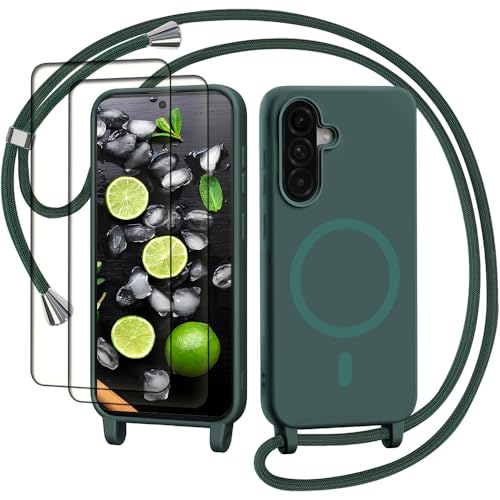 CaseLover Coque avec Cordon pour Samsung Galaxy A15 5G/A15 4G, Coque Magnétique de Cellulaire Corde Silicone Étui avec 2 Verre Trempé avec Réglable Collier Téléphone Chaîne Housse Case pour A15, Vert