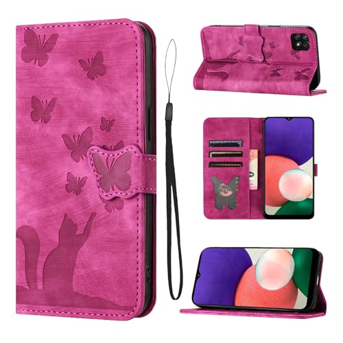 Kal-Housse Protection Pour Samsung Galaxy A22 5g / Samsung Galaxy A22s Matériau En Cuir Pu Coque Samsung A22 5g Avec Fentes Pour Cartes Étui Motif Papillon Chat Rose