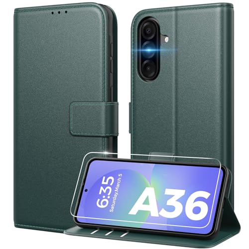 Peakally Coque pour Samsung Galaxy A36 5G [ Verre Trempé Protection *1 ] [ Blocage du Signal RFID ] [ Premium PU ] [ Pochette de Portefeuille ] Etui à Rabat pour Samsung A36 5G,Vert foncé