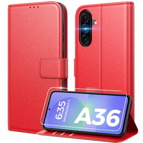 Peakally Coque pour Samsung Galaxy A36 5G [ Verre Trempé Protection *1 ] [ Blocage du Signal RFID ] [ Premium PU ] [ Pochette de Portefeuille ] Etui à Rabat pour Samsung A36 5G,Rouge