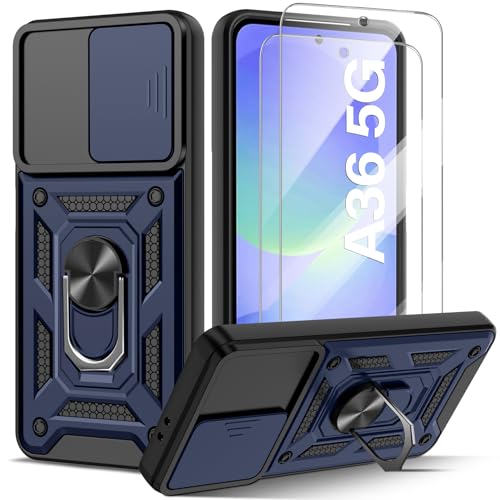 Guisessy Coque Compatible avec Samsung Galaxy A36 5G avec 2 Verre Trempé, Lentille Coulissante Couverture, Support 360° Rotatif Militaire PC Dur Renforcée Armor Antichoc Bumper Housse Etui - Bleu