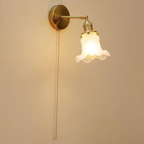Applique Murale Vintage avec Interrupteur à Tirette en Laiton, luminaire rétro Industriel E14 en Forme de Cloche et de Fleur, Abat-Jour en Verre, Appliques câblées, éclairage pour Chambre, Couloir
