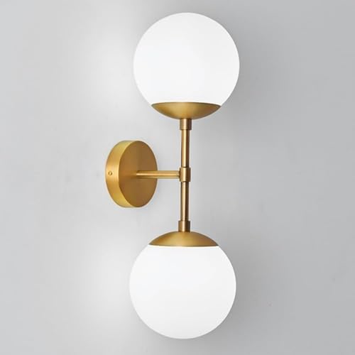 Hertl Applique murale à 2 têtes d'éclairage haut et bas, appliques murales en métal doré avec abat-jour boule en verre blanc mat, douille E27, luminaire mural de couloir intérieur, appliques murales g