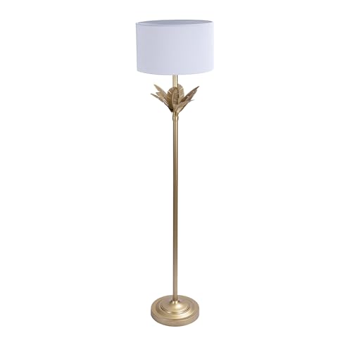 Relaxdays Lampe sur Pied avec Abat-Jour en Tissu, piètement Feuilles de Palmier, Douille E27, Blanc/doré, 152,5 x 33 x 3
