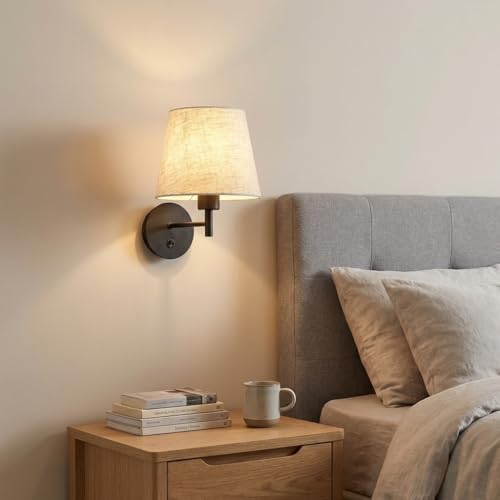 BARCELONA LED Applique Murale avec Abat-Jour en Lin Beige et Structure Métal Noir, Interrupteur Intégré, Lampe de Lecture pour Chambre, Bureau, Couloir, Escalier, Restaurant