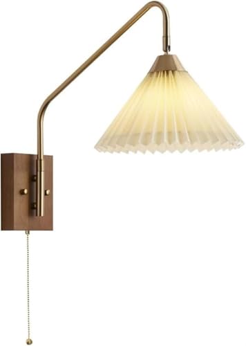CMBSSTFC Appliques murales Applique murale rétro en bois avec abat-jour en tissu plissé, bras pivotant doré, chaîne de traction, luminaire mural en bois de noyer réglable pour chevet, lecture, chambre