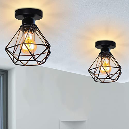 iDEGU Lot de 2 Plafonnier Industrielle en Métal Cage Noir Vintage Lustre Abat-jour Fer Rétro Lampe de Plafond E27 Luminaire d'eclairage pour Salon Chambre Café Bar Restaurent (Noir 20cm)