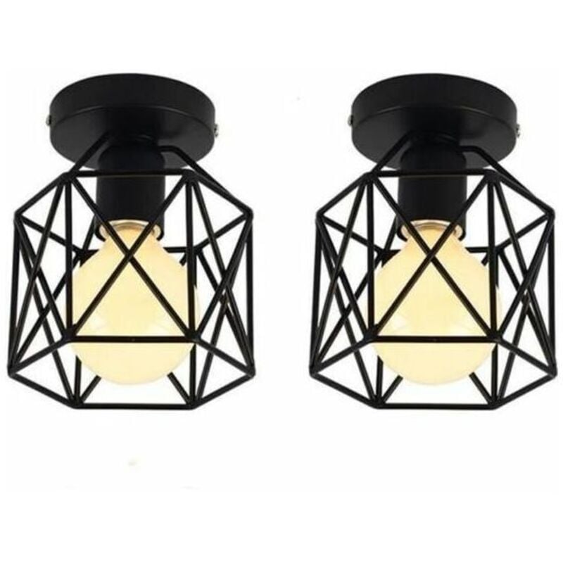 Lot de 2 Plafonnier Industrielle en Métal Cage Carré, 15CM Lustre Abat-jour Fer Luminaire E27 40W Noir pour Salon Chambre Bar (Hexagone)