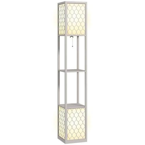 HOMCOM Lampadaire étagère, 2 lampes, lampe de salon sur pied avec douille E27, 2 étagères 4 niveaux, motif nid d'abeille, lampadaire salon, abat-jour en terylenecotton, gris