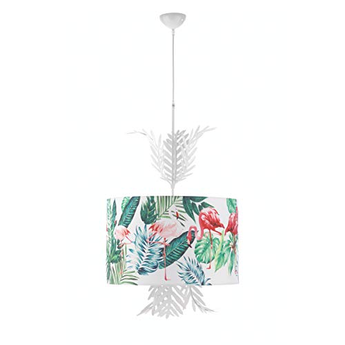 ONLI Suspension Flamingo avec abat-jour en tissu imprimé tropical sur fond blanc. Diamètre : 48 cm. Avec fougère Bianco, Verde, Rosa